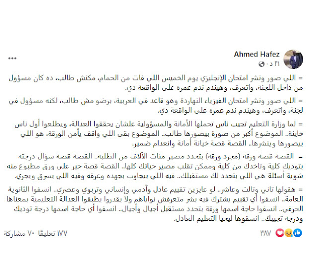 = لما وزارة التعليم تجيب ناس تحملها الأمانة والمسؤولية علشان يحققوا العدالة، ويطلعوا أول ناس خاينة.. الموضوع أكبر من صورة بيصورها طالب.. الموضوع بقى اللي واقف يأمن الورقة، هو اللي بيصورها وينشرها.. القصة قصة خيانة أمانة وانعدام ضمير.